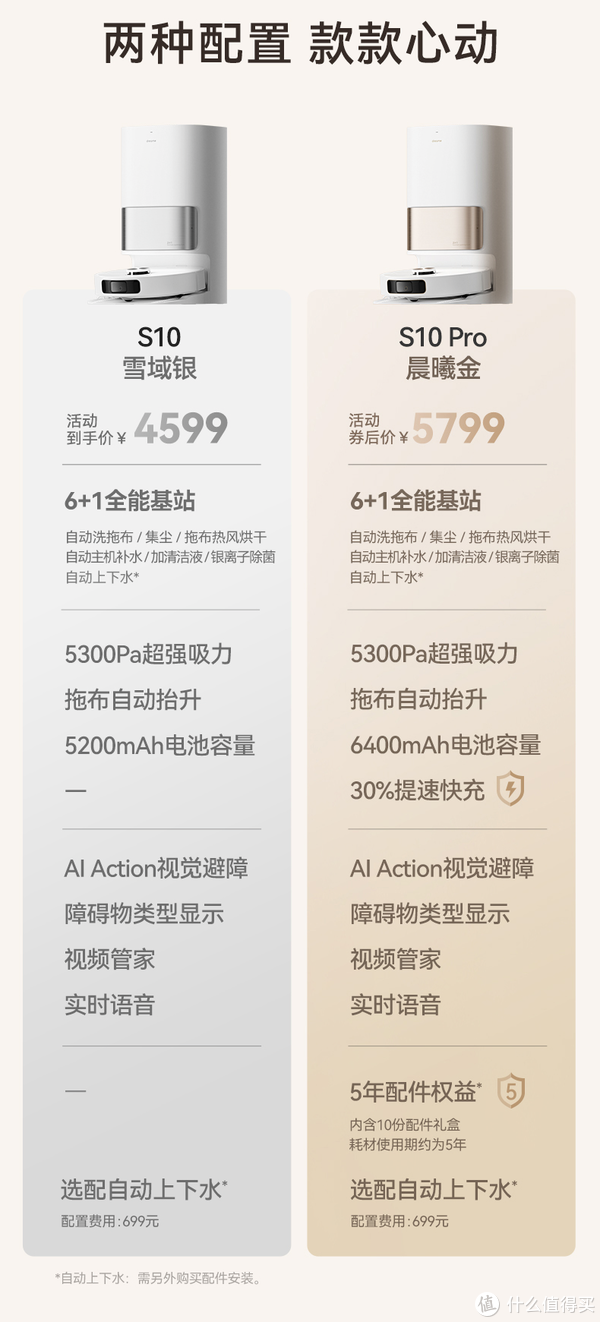 5年配件权益包含10份配件礼盒,单价410元/份,总价值 4100元。对长期使用的用户来说, 这个配件其实就是损耗, 就如同汽车保养一样, 其实也要算到成本里头去, 我考虑下来, 觉得追觅S10 Pro可能会更加划算。