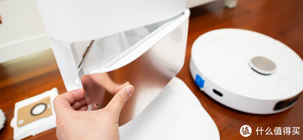 手动会量是全能机房的标配了, 追觅也不例外, 这里采用了一次性尘袋设计, 安装和拆卸方便。 随包装多赠送了一个尘袋。